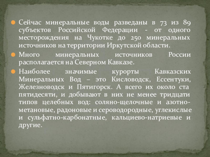 Слайд 5Сейчас минеральные воды разведаны в 73 из 89 субъектов Российской Федерации
