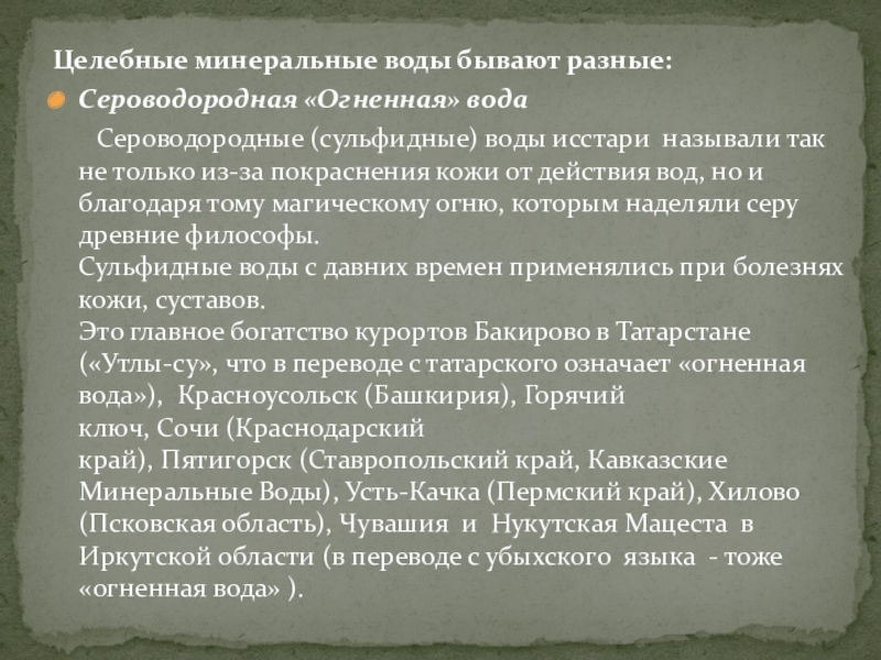 Это главное богатство курортов Бакирово в Татарстане («Утлы-су», что в переводе с татарского означает «огненная вода»), Красноусольск (Башкирия), Горячий ключ, Сочи (Краснодарский край), Пятигорск (Ставропольский край, Кавказские Минеральные Воды), Усть-Качка (Пермский край), Хилово (Псковская область), Чувашия и Нукутская Мацеста в Иркутской области (в переводе с убыхского языка - тоже «огненная вода» ).
