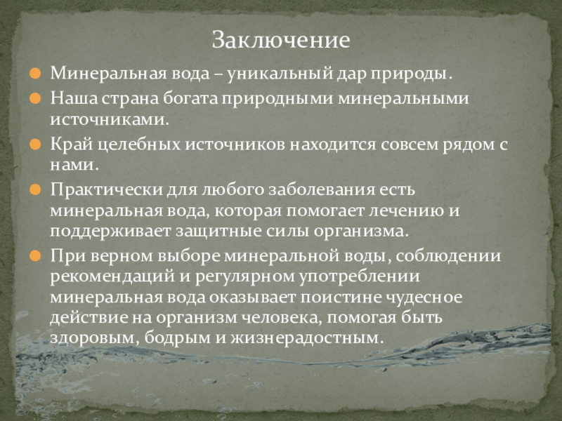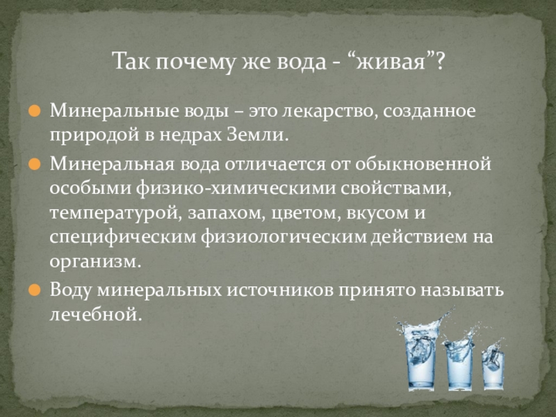 Слайд 11Минеральные воды – это лекарство, созданное природой в недрах Земли.