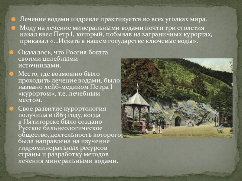 лечение водами, было названо лейб-медиком Петра I «курортом», т.е. лечебным местом.