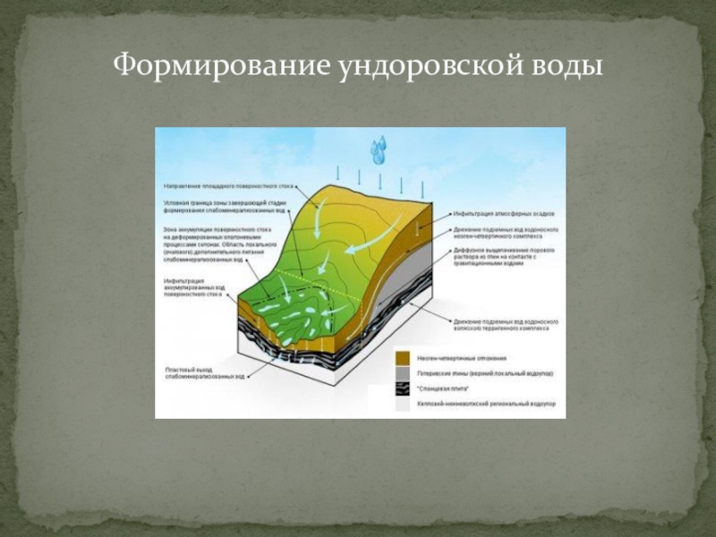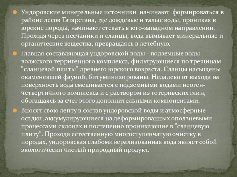Слайд 20Ундоровские минеральные источники начинают формироваться в районе лесов Татарстана, где дождевые