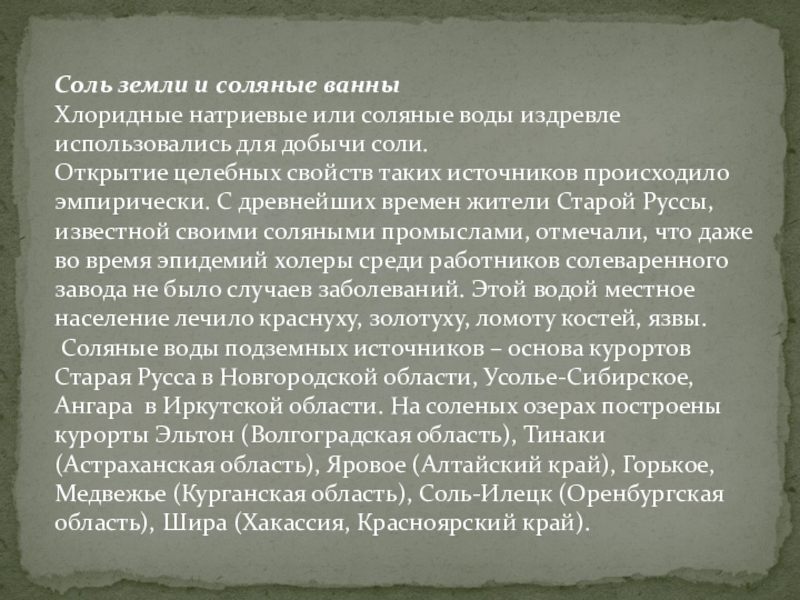 Соляные воды подземных источников – основа курортов Старая Русса в Новгородской области, Усолье-Сибирское, Ангара в Иркутской области. На соленых озерах построены курорты Эльтон (Волгоградская область), Тинаки (Астраханская область), Яровое (Алтайский край), Горькое, Медвежье (Курганская область), Соль-Илецк (Оренбургская область), Шира (Хакассия, Красноярский край).