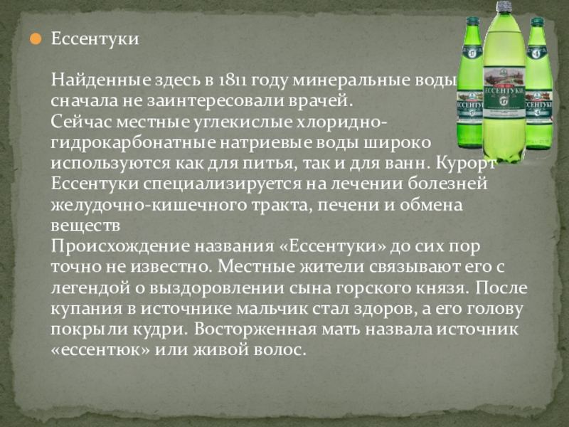 углекислые хлоридно-гидрокарбонатные натриевые воды широко используются как для питья, так и для ванн. Курорт Ессентуки специализируется на лечении болезней желудочно-кишечного тракта, печени и обмена веществ