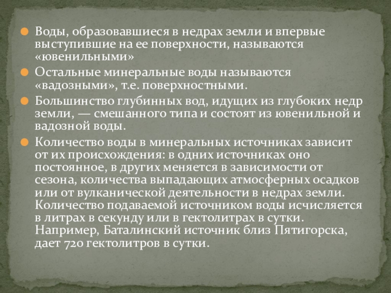 Слайд 9Воды, образовавшиеся в недрах земли и впервые выступившие на ее поверхности,