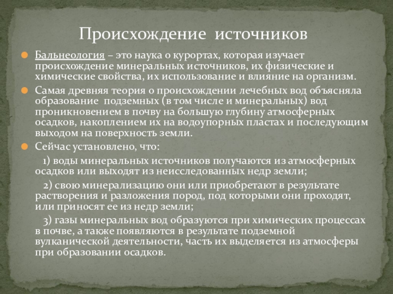 Слайд 7Бальнеология – это наука о курортах, которая изучает происхождение минеральных источников,