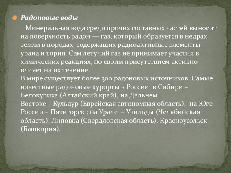 В мире существует более 300 радоновых источников. Самые известные радоновые курорты в России: в Сибири –Белокуриха (Алтайский край), на Дальнем Востоке – Кульдур (Еврейская автономная область), на Юге России – Пятигорск ; на Урале – Увильды (Челябинская область), Липовка (Свердловская область), Красноусольск (Башкирия).