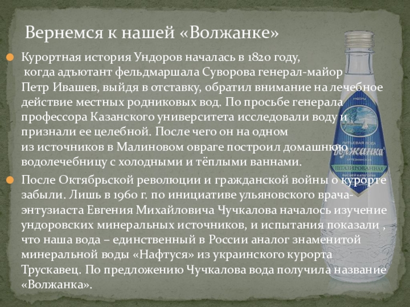 После Октябрьской революции и гражданской войны о курорте забыли. Лишь в 1960 г. по инициативе ульяновского врача-энтузиаста Евгения Михайловича Чучкалова началось изучение ундоровских минеральных источников, и испытания показали , что наша вода – единственный в России аналог знаменитой минеральной воды «Нафтуся» из украинского курорта Трускавец. По предложению Чучкалова вода получила название «Волжанка».
