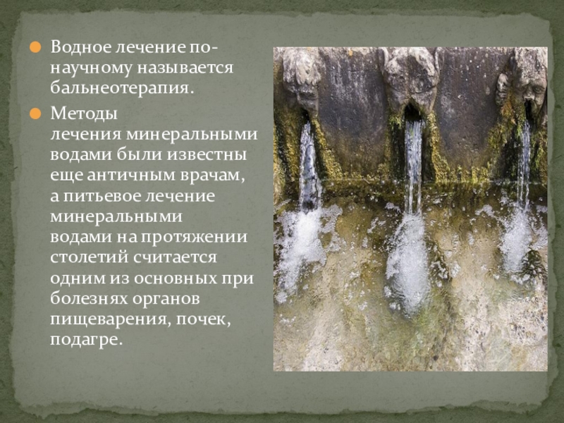 Слайд 12Водное лечение по-научному называется бальнеотерапия.