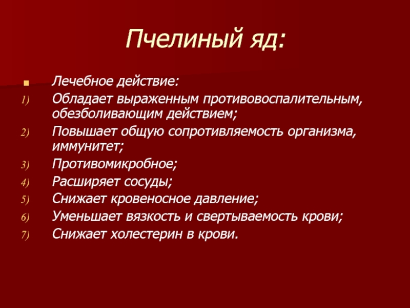 сложный и до конца не выяснен. Воск очень богат витамином А, необходимым для развития эпителия кожи, слизистой бронхов, горла, носа, желудка и кишечника, для остроты зрения. Обладает противомикробным, питательным и регенерирующим действием.