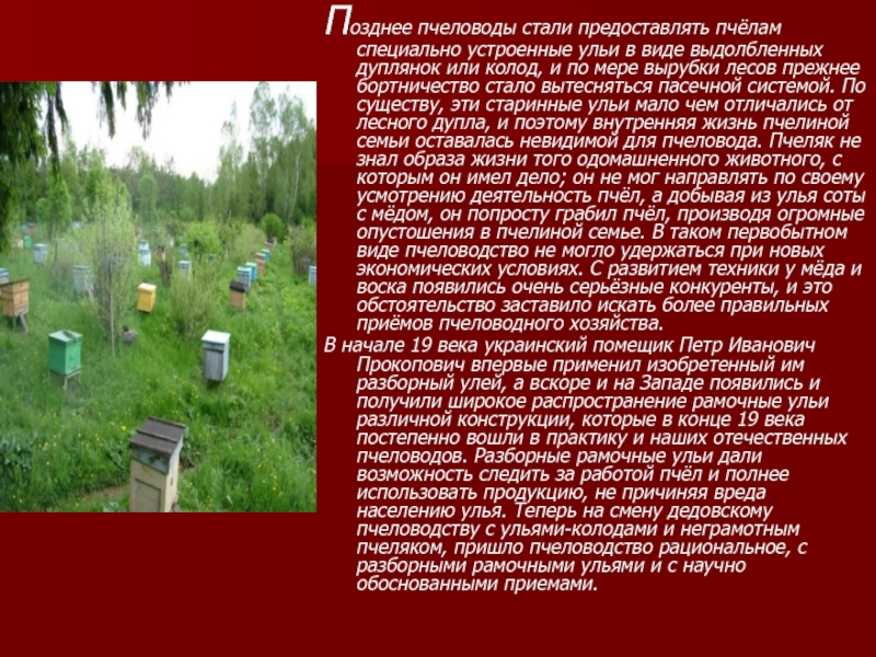 Слайд 11Позднее пчеловоды стали предоставлять пчёлам специально устроенные ульи в виде выдолбленных