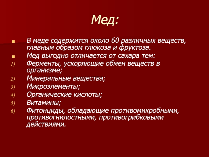 В меде содержится около 60 различных веществ, главным образом глюкоза и