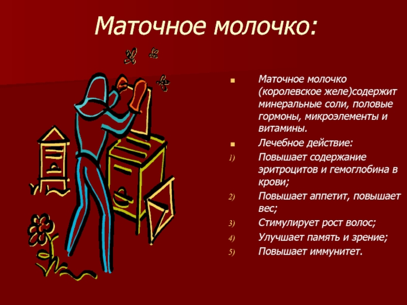 Маточное молочко(королевское желе)содержит минеральные соли, половые гормоны, микроэлементы и витамины.