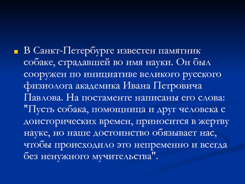 В Санкт-Петербурге известен памятник собаке, страдавшей во имя науки. Он был