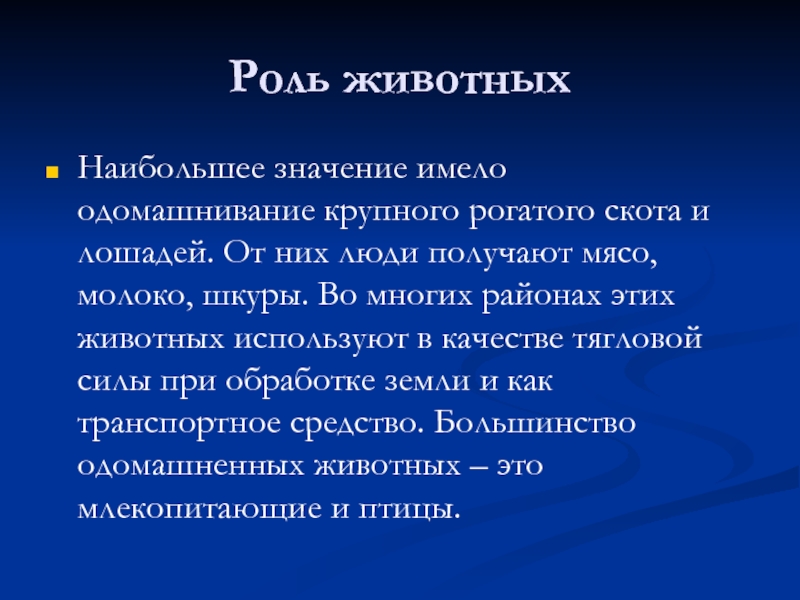 них люди получают мясо, молоко, шкуры. Во многих районах этих животных используют в качестве тягловой силы при обработке земли и как транспортное средство. Большинство одомашненных животных – это млекопитающие и птицы.