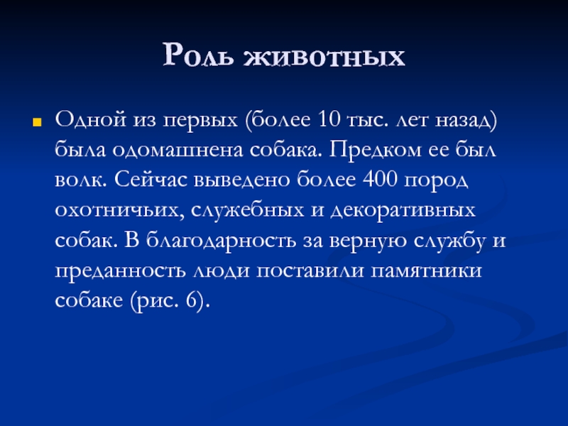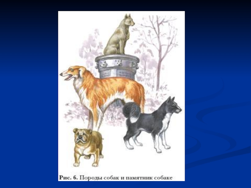 собака. Предком ее был волк. Сейчас выведено более 400 пород охотничьих, служебных и декоративных собак. В благодарность за верную службу и преданность люди поставили памятники собаке (рис. 6).