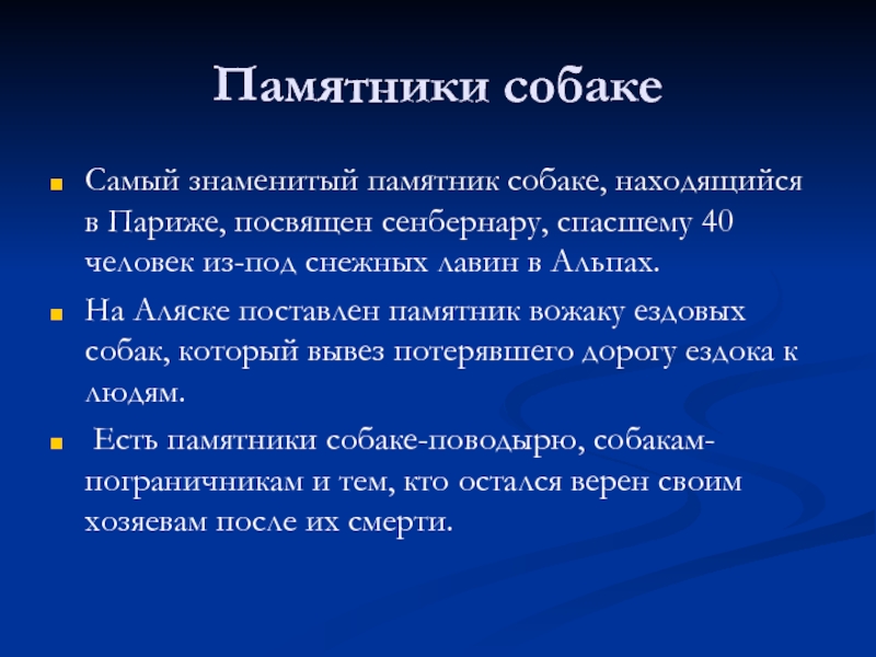 Есть памятники собаке-поводырю, собакам-пограничникам и тем, кто остался верен своим хозяевам после их смерти.