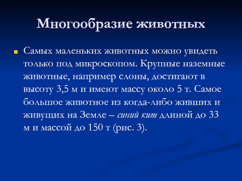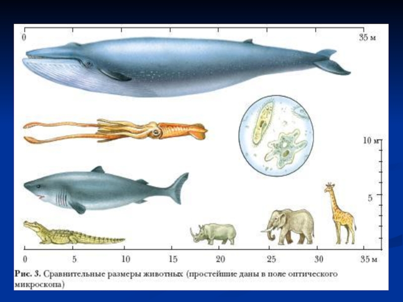 животные, например слоны, достигают в высоту 3,5 м и имеют массу около 5 т. Самое большое животное из когда-либо живших и живущих на Земле – синий кит длиной до 33 м и массой до 150 т (рис. 3).