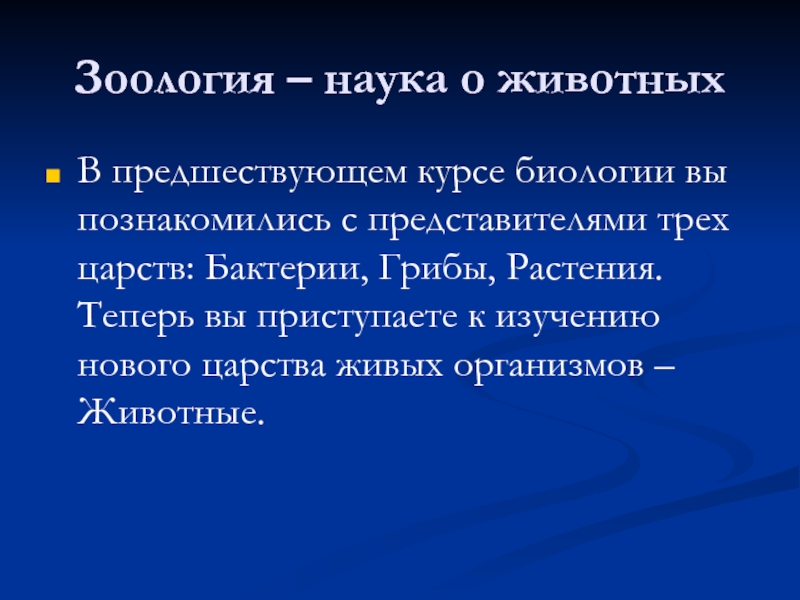 трех царств: Бактерии, Грибы, Растения. Теперь вы приступаете к изучению нового царства живых организмов – Животные.