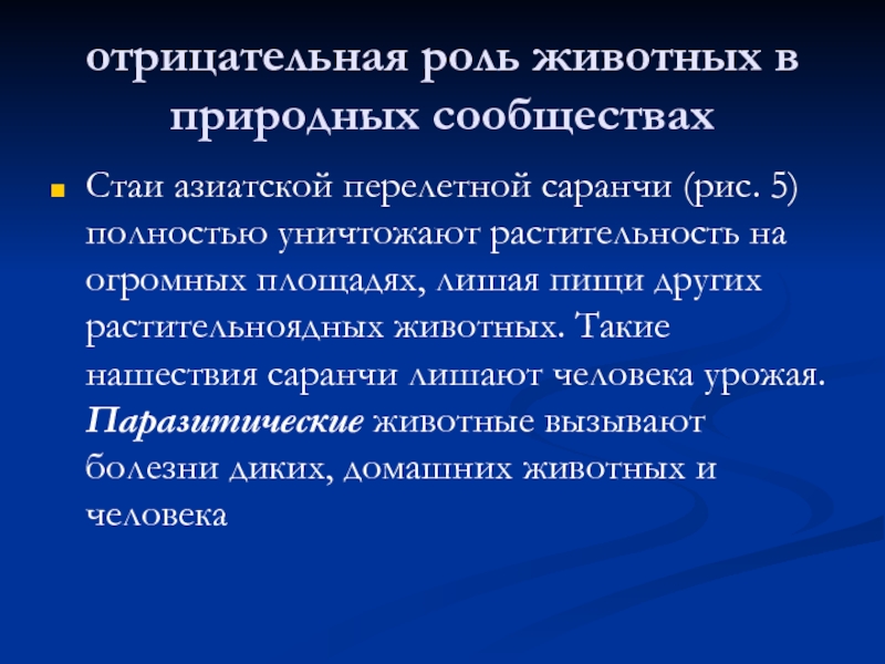 полностью уничтожают растительность на огромных площадях, лишая пищи других растительноядных животных. Такие нашествия саранчи лишают человека урожая. Паразитические животные вызывают болезни диких, домашних животных и человека