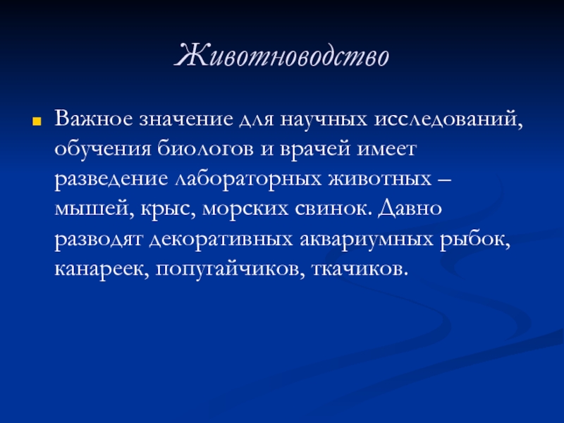 лабораторных животных – мышей, крыс, морских свинок. Давно разводят декоративных аквариумных рыбок, канареек, попугайчиков, ткачиков.