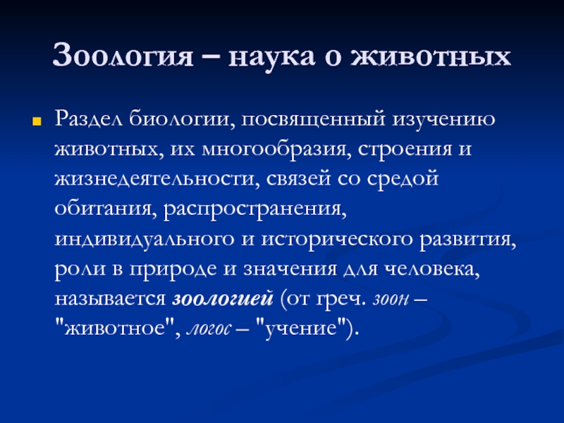 и жизнедеятельности, связей со средой обитания, распространения, индивидуального и исторического развития, роли в природе и значения для человека, называется зоологией (от греч. зоон – "животное", логос – "учение").