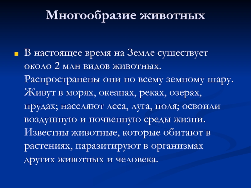 животных. Распространены они по всему земному шару. Живут в морях, океанах, реках, озерах, прудах; населяют леса, луга, поля; освоили воздушную и почвенную среды жизни. Известны животные, которые обитают в растениях, паразитируют в организмах других животных и человека.
