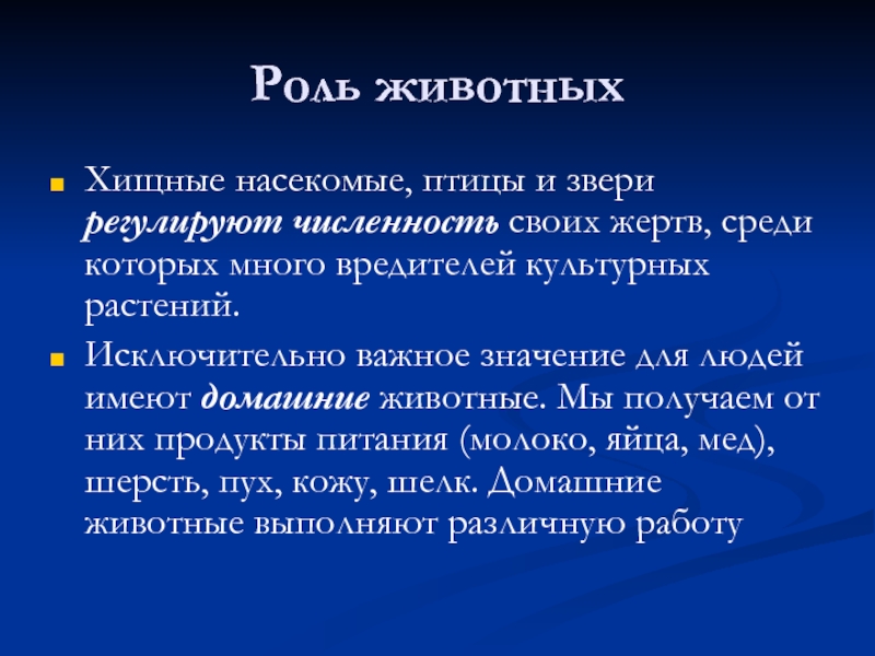 Исключительно важное значение для людей имеют домашние животные. Мы получаем от них продукты питания (молоко, яйца, мед), шерсть, пух, кожу, шелк. Домашние животные выполняют различную работу