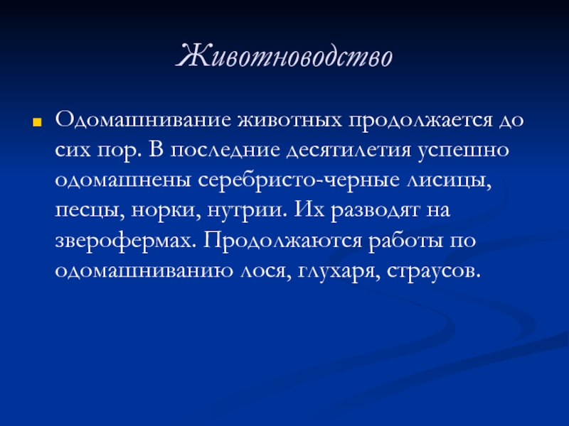 серебристо-черные лисицы, песцы, норки, нутрии. Их разводят на зверофермах. Продолжаются работы по одомашниванию лося, глухаря, страусов.