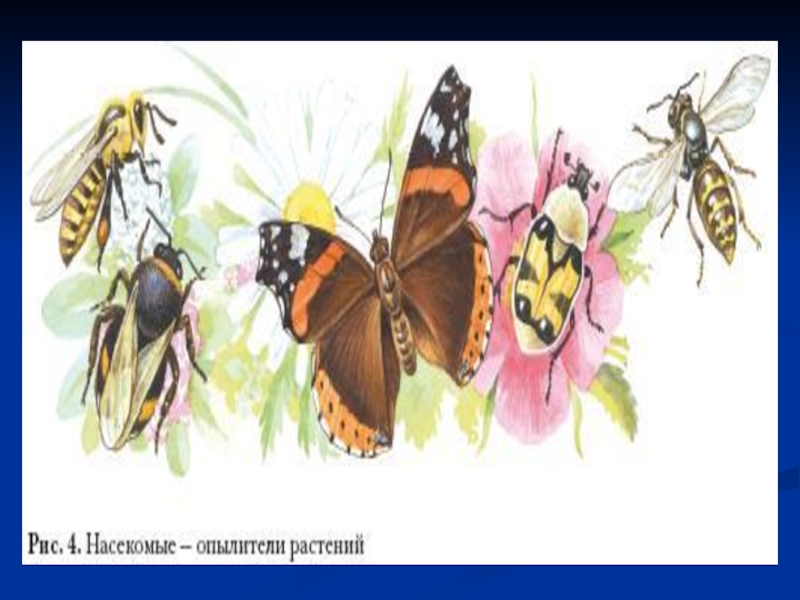 облику, строению, образу жизни, но и по той роли, которую они играют в природных сообществах. Велика роль в природе животных – опылителей растений (рис. 4). Это бабочки, жуки, мухи, шмели, пчелы и др. Без них облик наших лесов, лугов, полей был бы совсем другим.