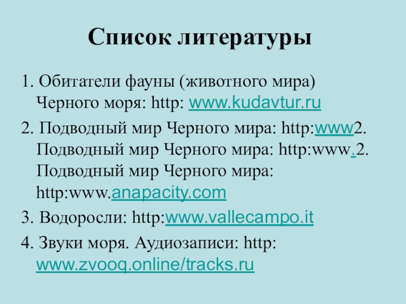 Список литературы1. Обитатели фауны (животного мира) Черного моря: http: www.kudavtur.ru 2. Подводный мир Черного мира: http:www2. Подводный