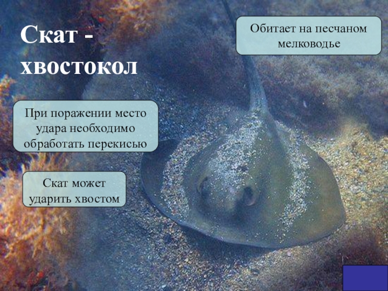 Скат -хвостоколОбитает на песчаном мелководьеПри поражении место удара необходимо обработать перекисьюСкат может ударить хвостом