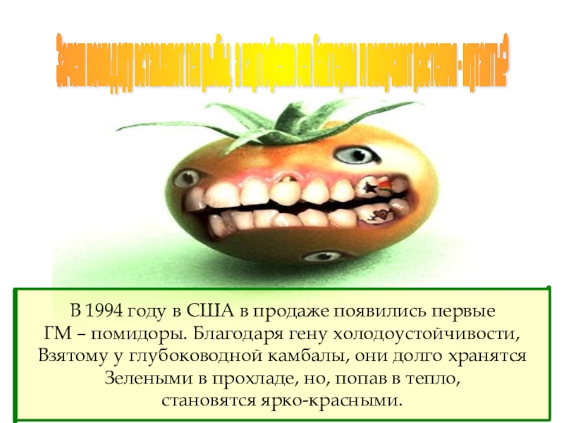 Слайд 5Зачем помидору вставляют ген рыбы, а картофелю ген бактерии и получают