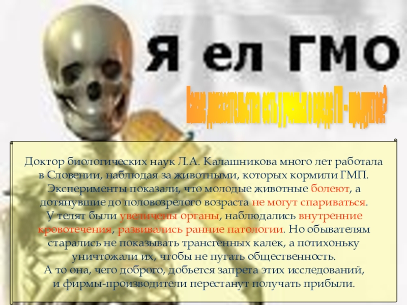 Слайд 12Какие доказательства есть у ученых о вреде ГМ – продуктов?