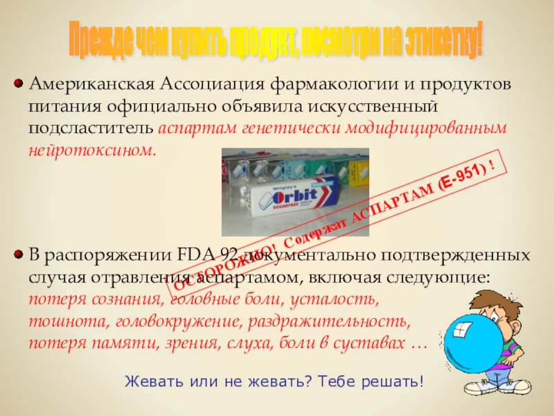 Слайд 10ОСТОРОЖНО! Содержат АСПАРТАМ (E-951) !