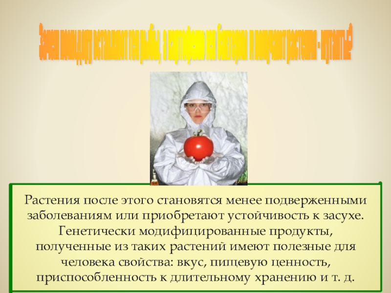 Слайд 6Зачем помидору вставляют ген рыбы, а картофелю ген бактерии и получают