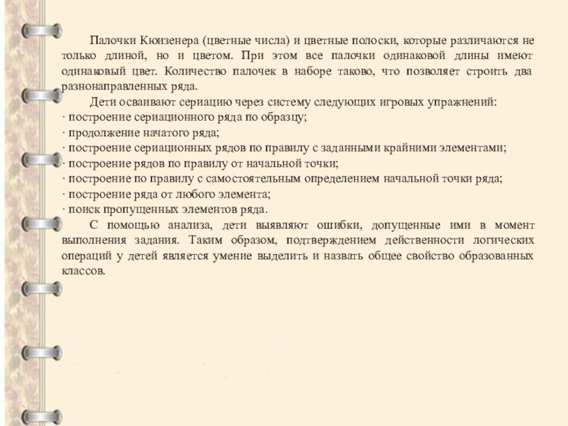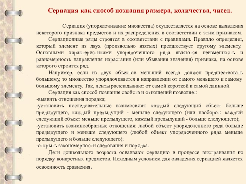 Дети дошкольного возраста осваивают сериацию в процессе выстраивания по порядку конкретных предметов. Исходным условием для овладения сериацией является освоенность сравнения.