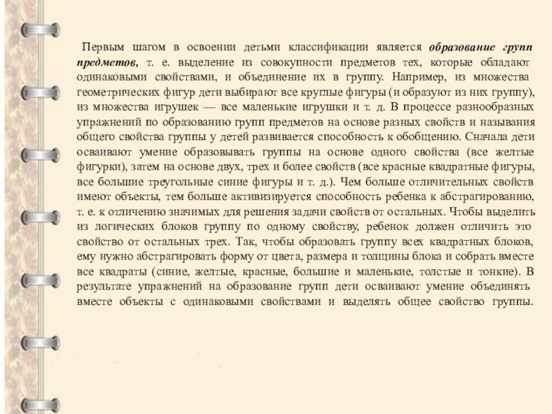 групп предметов, т. е. выделение из совокупности предметов тех, которые обладают одинаковыми свойствами, и объединение их в группу. Например, из множества геометрических фигур дети выбирают все круглые фигуры (и образуют из них группу), из множества игрушек — все маленькие игрушки и т. д. В процессе разнообразных упражнений по образованию групп предметов на основе разных свойств и называния общего свойства группы у детей развивается способность к обобщению. Сначала дети осваивают умение образовывать группы на основе одного свойства (все желтые фигурки), затем на основе двух, трех и более свойств (все красные квадратные фигуры, все большие треугольные синие фигуры и т. д.). Чем больше отличительных свойств имеют объекты, тем больше активизируется способность ребенка к абстрагированию, т. е. к отличению значимых для решения задачи свойств от остальных. Чтобы выделить из логических блоков группу по одному свойству, ребенок должен отличить это свойство от остальных трех. Так, чтобы образовать группу всех квадратных блоков, ему нужно абстрагировать форму от цвета, размера и толщины блока и собрать вместе все квадраты (синие, желтые, красные, большие и маленькие, толстые и тонкие). В результате упражнений на образование групп дети осваивают умение объединять вместе объекты с одинаковыми свойствами и выделять общее свойство группы.