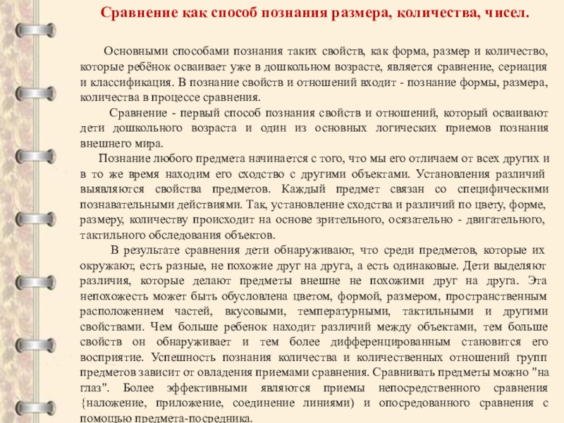 таких свойств, как форма, размер и количество, которые ребёнок осваивает уже в дошкольном возрасте, является сравнение, сериация и классификация. В познание свойств и отношений входит - познание формы, размера, количества в процессе сравнения.