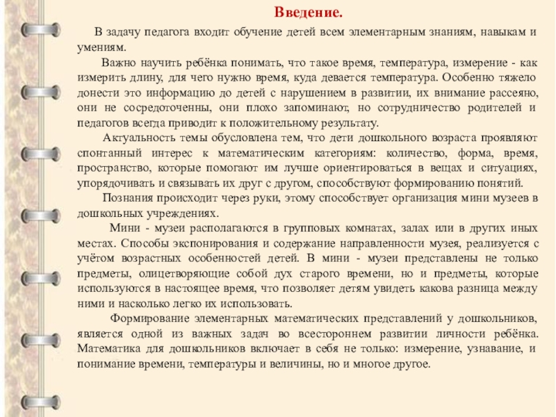 Важно научить ребёнка понимать, что такое время, температура, измерение - как измерить длину, для чего нужно время, куда девается температура. Особенно тяжело донести это информацию до детей с нарушением в развитии, их внимание рассеяно, они не сосредоточенны, они плохо запоминают, но сотрудничество родителей и педагогов всегда приводит к положительному результату.