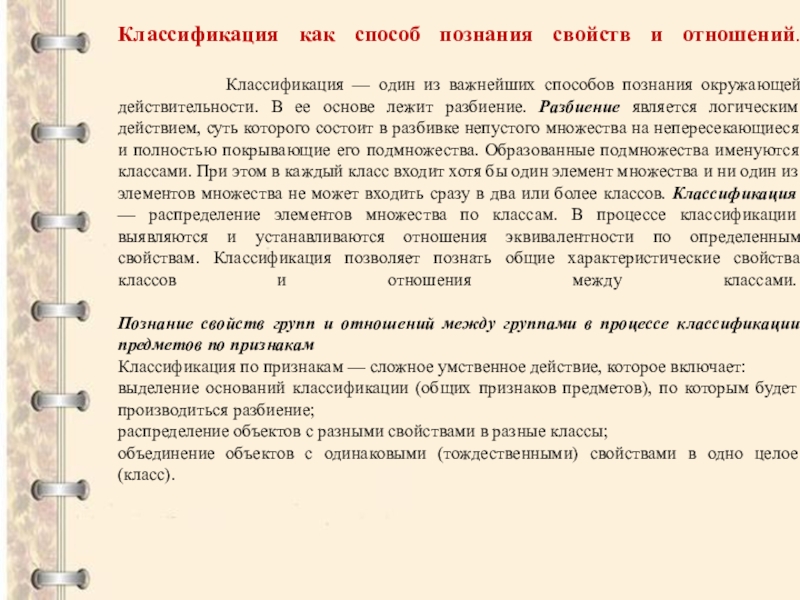 Классификация — один из важнейших способов познания окружающей действительности. В ее основе лежит разбиение. Разбиение является логическим действием, суть которого состоит в разбивке непустого множества на непересекающиеся и полностью покрывающие его подмножества. Образованные подмножества именуются классами. При этом в каждый класс входит хотя бы один элемент множества и ни один из элементов множества не может входить сразу в два или более классов. Классификация — распределение элементов множества по классам. В процессе классификации выявляются и устанавливаются отношения эквивалентности по определенным свойствам. Классификация позволяет познать общие характеристические свойства классов и отношения между классами.
