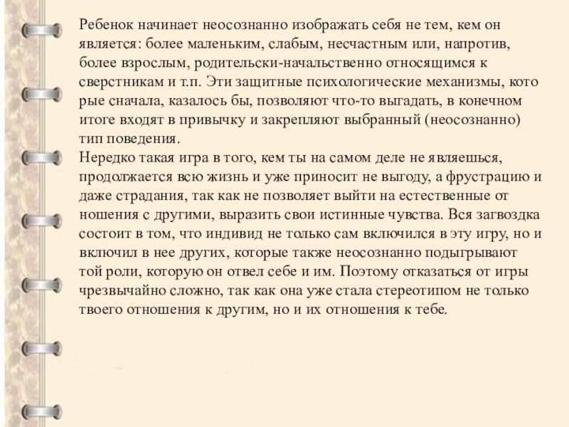 Нередко такая игра в того, кем ты на самом деле не являешься, продолжается всю жизнь и уже приносит не выгоду, а фрустрацию и даже страдания, так как не позволяет выйти на естественные отношения с другими, выразить свои истинные чувства. Вся загвоздка состоит в том, что индивид не только сам включился в эту игру, но и включил в нее других, которые также неосознанно подыгрывают той роли, которую он отвел себе и им. Поэтому отказаться от игры чрезвычайно сложно, так как она уже стала стереотипом не только твоего отношения к другим, но и их отношения к тебе.