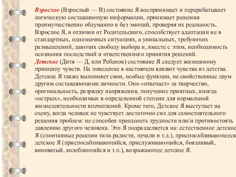 Слайд 5Взрослое (Взрослый — В) состояние Я воспринимает и перерабатывает логическую составляющую информации,