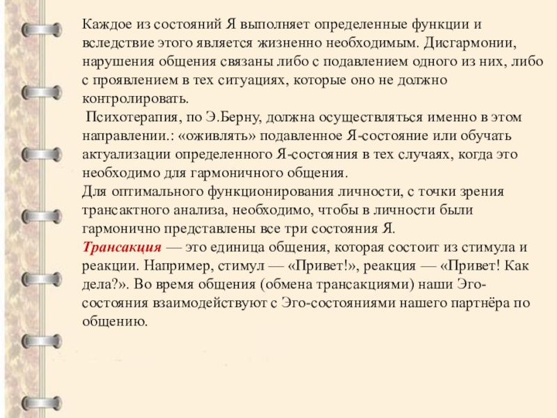 Для оптимального функционирования личности, с точки зрения трансактного анализа, необходимо, чтобы в личности были гармонично представлены все три состояния Я.