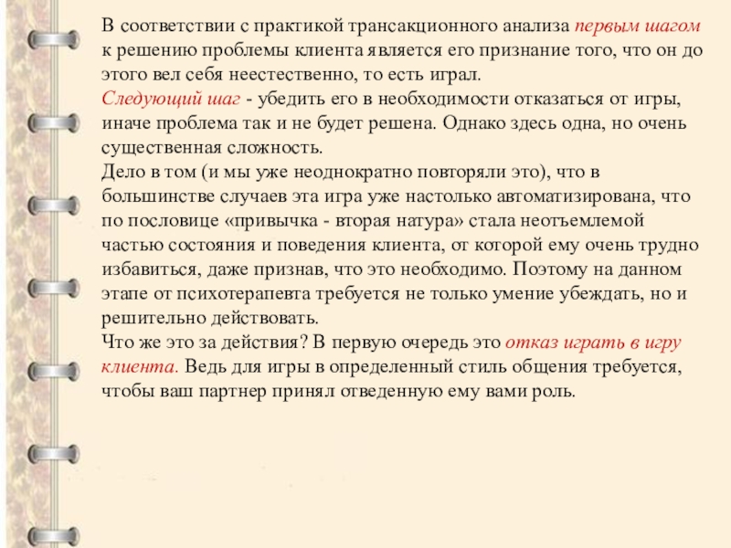 Слайд 14В соответствии с практикой трансакционного анализа первым шагом к решению проблемы