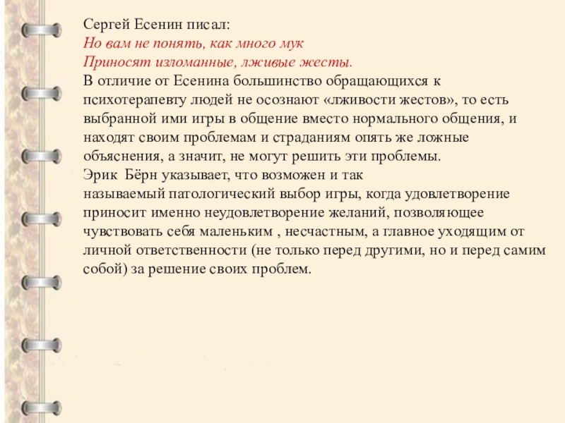 В отличие от Есенина большинство обращающихся к психотерапевту людей не осознают «лживости жестов», то есть выбранной ими игры в общение вместо нормального общения, и находят своим проблемам и страданиям опять же ложные объяснения, а значит, не могут решить эти проблемы.
