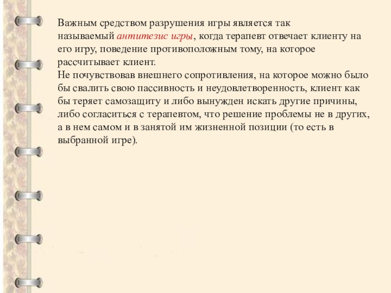Слайд 17Важным средством разрушения игры является так называемый антитезис игры, когда терапевт отвечает