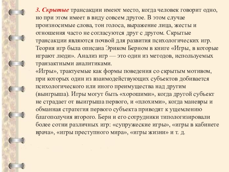 в виду совсем другое. В этом случае произносимые слова, тон голоса, выражение лица, жесты и отношения часто не согласуются друг с другом. Скрытые трансакции являются почвой для развития психологических игр. Теория игр была описана Эриком Берном в книге «Игры, в которые играют люди». Анализ игр — это один из методов, используемых транзактными аналитиками.