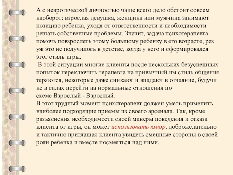 В этой ситуации многие клиенты после нескольких безуспешных попыток переключить терапевта на привычный им стиль общения теряются, некоторые даже сникают и впадают в отчаяние, будучи не в силах перейти на нормальные отношения по схеме Взрослый - Взрослый.