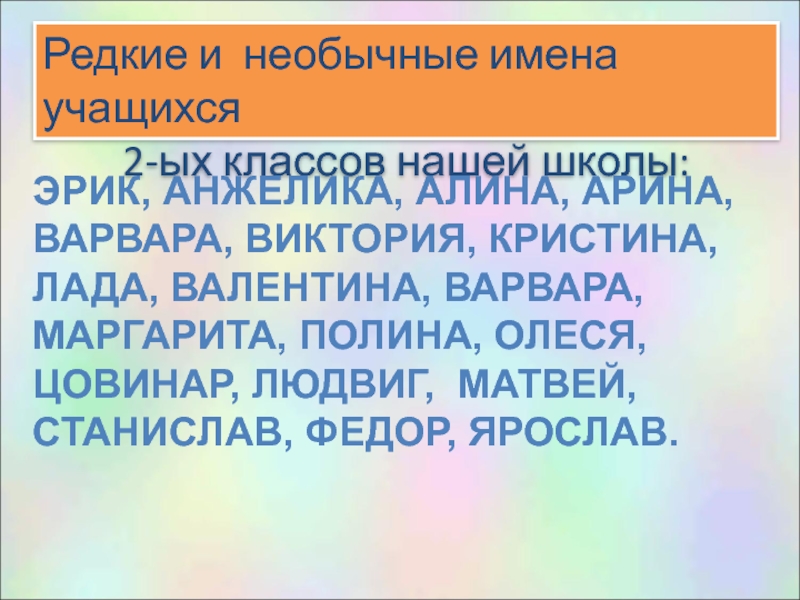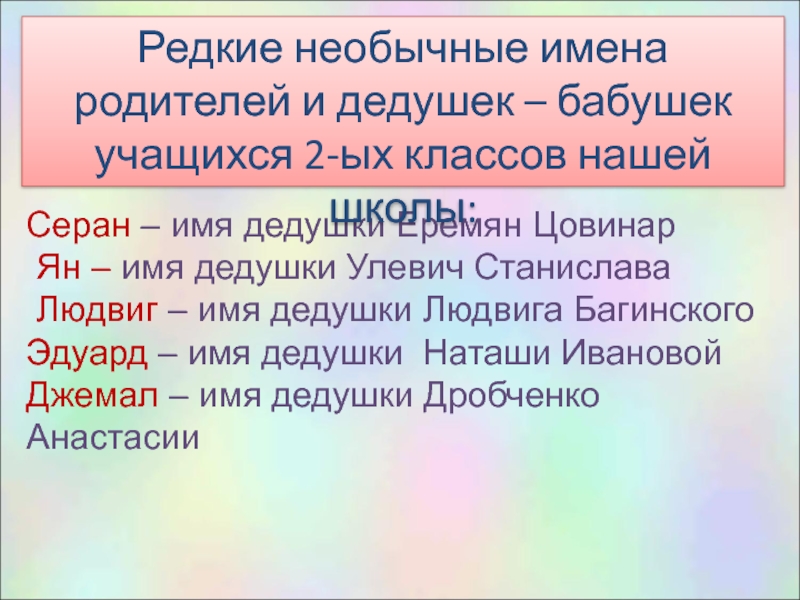 Редкие необычные имена родителей и дедушек – бабушек учащихся 2-ых классов нашей школы: