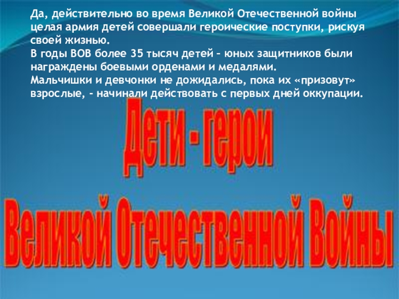 Слайд 3Да, действительно во время Великой Отечественной войны целая армия детей совершали
